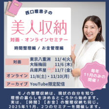 セミナー・講演情報 セミナー・講演依頼はこちら 2025.11.04 対面 セミナー 美人収納セミナー 時間整理編/お金管理編 会場 東京八重洲倶楽部 定員 14名 2025.11.06 対面 セミナー 美人収納セミナー 時間整理編/お金管理編 会場 大阪梅田(阪急百貨店の上) 定員 14名 2025.11.08 オンライン セミナー 美人収納セミナー 時間整理編/お金管理編 会場 Zoom 定員 14名