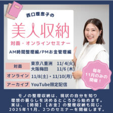 セミナー・講演情報 セミナー・講演依頼はこちら 2025.11.01 グランフロント大阪 ナレッジシアター セミナー 住み替えと暮らしのセミナー2025 会場 グランフロント大阪 ナレッジシアター 定員 300名 2025.11.04 対面 セミナー 美人収納セミナー 時間整理編/お金管理編 会場 東京八重洲倶楽部 定員 14名 2025.11.08 対面 セミナー 美人収納セミナー 時間整理編/お金管理編 会場 大阪梅田(阪急百貨店の上) 定員 14名
